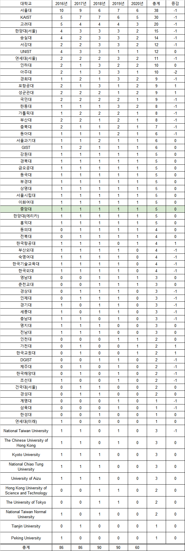 총계와 최근 ICPC 참가 팀수가 많은 학교를 상위로 정렬하였으며, 그래도 동률일 경우는 가나다순으로 정렬했다. 정리해본 결과 점점 가면 갈수록 다양한 대학에 TO를 주기 위한 노력을 한다는 것을 볼 수 있다.