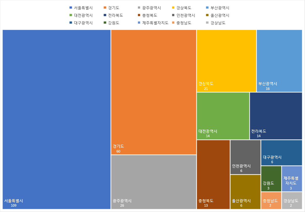 2021년 ICPC 인터넷 예선 학교별 참가 팀 수에 대한 데이터를 토대로 지역(광역자치단체)별 참가 팀 수를 정리해보았습니다.