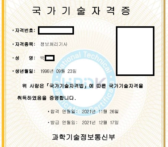 2021년 3회차에 정보처리기사 실기에 합격하면서 최종적으로 정보처리기사 자격증을 취득하였습니다.